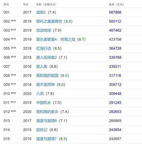 你有没有想过,当你在电影院里享受一部国产电影带来的欢笑或感动时,那些电影背后隐藏着怎样的票房故事呢?今天,就让我们一起揭开国产票房排行榜的神秘面纱,看看那些在银幕上熠熠生辉的电影,是如何征服观众的心的。
